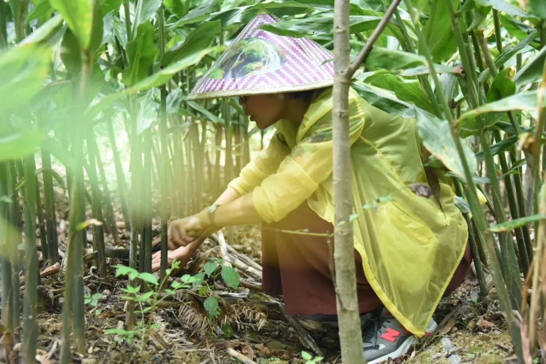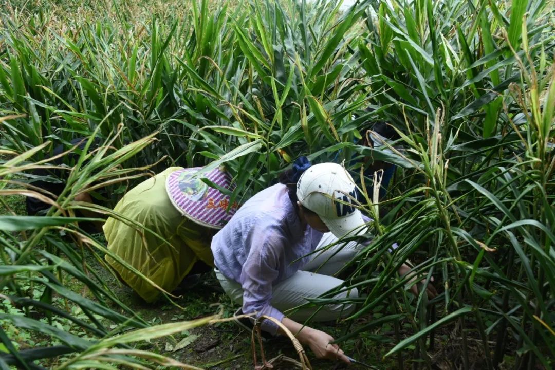 叶美燕与帮扶工作人员一起帮助罗利红采割阳荷