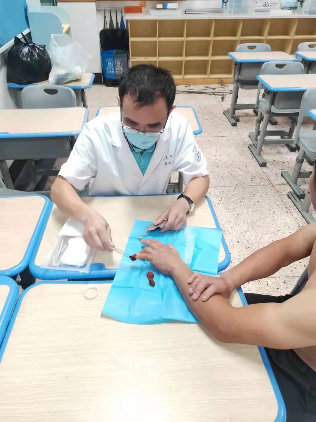7 月 25 日傍晚,新塘街道王师傅因台风天路滑不慎摔跤导致手部受伤,新塘分院西许服务站医生周祖国得知后赶紧抓起急救药箱,冒雨赶赴病人所在地为他进行治疗。
