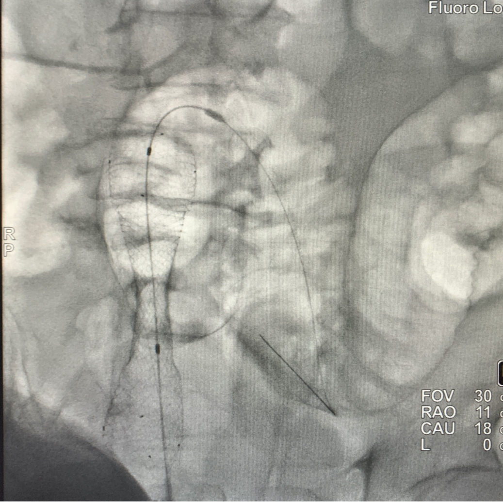 通过导丝成功于直乙交界处放置支架