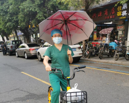 吕华是医院手术麻醉科护士长,由于采样点位多,她一直骑共享单车巡视其负责的四个组情况。她骑着自行车风驰电掣的身影成为医院附近一道活力满满的风景线。一日,她冒着大雨一手骑车一手撑伞运送物资,由于地面湿滑不小心拉伤了腿,但想到点位的采样队员正等待物资,便忍着腿疼步行赶往,「我是医务人员,为人民奉献是我义不容辞的义务与责任。」