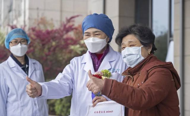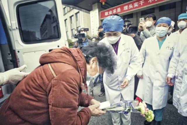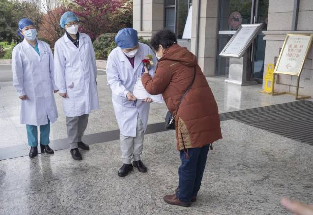 这是武汉大学人民医院东院区第 600 位出院患者。武汉大学人民医院副院长江应安,东院区副院长吴凡等领导一同为她送行。