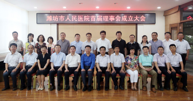 7 月 31 日下午,潍坊市人民医院首届理事会成立大会召开。市卫生计生委党委书记、主任吴海源同志,市事业单位监督管理局局长孙建成同志到会讲话,市卫生计生委党委委员、副主任孟庆阳同志主持会议。潍坊市人民医院首届理事会、监事会全体成员及医院领导班子全体成员参加会议。