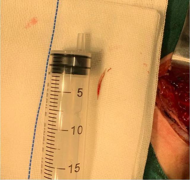 李学昌、陈尧向患者及家属解释患者目前病情危急,感染加重随时可能出现纵膈感染甚至感染性休克,需要急诊手术取鸡骨,并解释手术方式及可能出现损伤喉返神经引起声嘶、损伤大动脉引起大出血等严重并发症,患者及家属表示理解,给予安排手术。手术由头颈外科手术经验丰富的陈尧主刀,于胸骨上窝一横指处颈部正中作横行切口,分离出左侧喉返神经,分离出甲状腺下级,分离出气管后壁、食管前壁,仍未发现脓肿,考虑可能位于食管后壁,继续探查食管周围,于食管后方发现脓肿,抽出约 15 ml 黄绿色脓液,臭鸡蛋味,于脓肿腔内发现约 2 cm 长鸡骨一块(如图)。冲洗脓腔,放置引流管,关闭术腔。