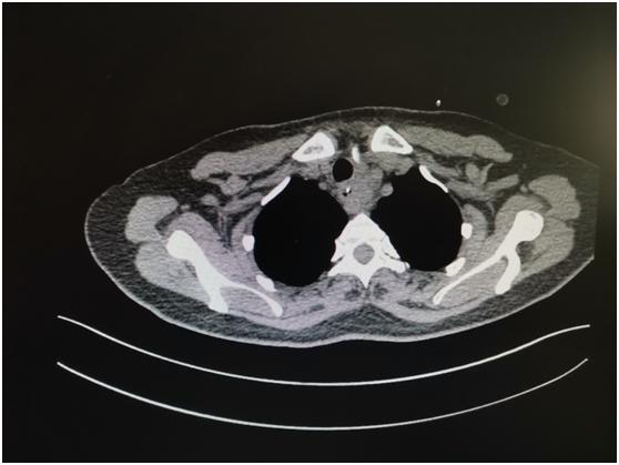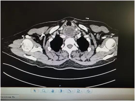 近日,患者来我院耳鼻喉科就诊,主任医师李学昌查看后嘱其立即行胸部 CT 平扫+强化,结果显示:食管上端见囊性影,大约 3.2 cm×4 cm,内见斜行条形高密度影及液气平面,增强见环形强化,此脓肿前位于气管后方,后至颈椎前方,上位于食管上端,锁骨水平,下至上纵膈。