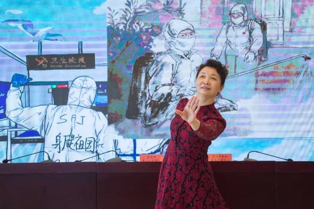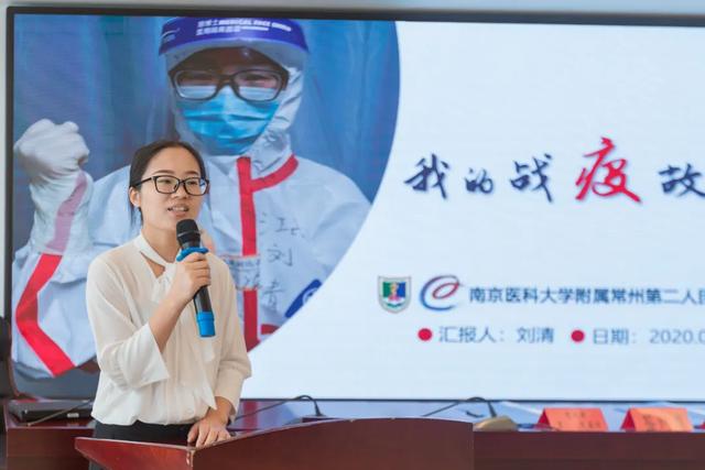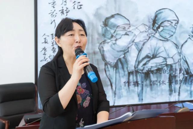 市二院援鄂医疗队员刘清首先做事迹报告,深情讲述驰援湖北黄石 38 天的战「疫」故事。身为护士又作为母亲的刘清向大家展示了其救死扶伤过程中的英勇无畏、沉着冷静,又展现了其面对女儿的依依不舍、温婉深情。
