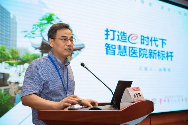 随后,常州二院院长汤黎明以《打造 E 时代下智慧医院新标杆》为题,向与会嘉宾介绍了常州二院以智慧病历为核心的智慧医疗、以 HQS 为保障的智慧管理、以互联网医院为特色的智慧服务三方面的工作。