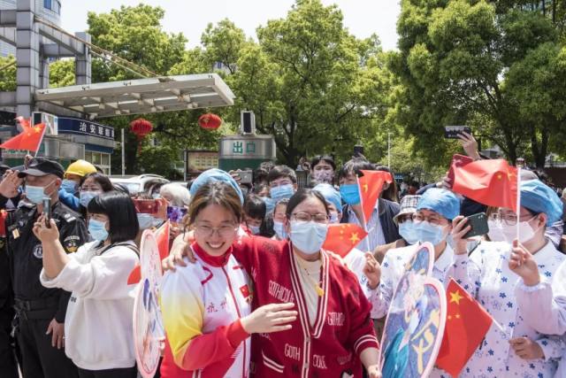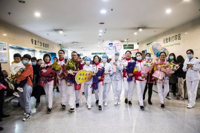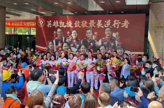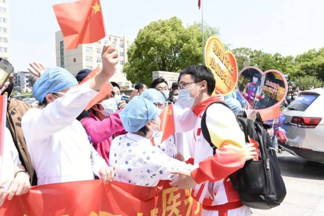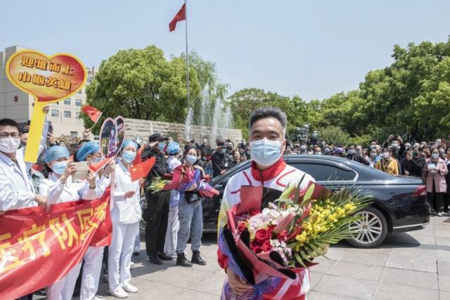 在灿烂的阳光下,医疗队员们走下车,领导和同事们上前送上鲜花和拥抱。现场,欢呼响亮,掌声不断,泪水与笑声齐飞。经过五十多天的一线奋战和 15 天的隔离休养,他们终于平安地回到了亲人和同事身边,彼此紧紧相拥,尽情抒发想念。