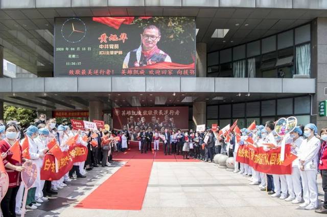 医院门诊门口,欢迎队和市民朋友们手举「白衣执甲援荆楚,今朝凯旋平安归!」「千里驰援,不辱使命」「致敬英雄」等横幅和标语牌,挥舞着国旗,齐声欢呼「英雄凯旋,欢迎回家」!