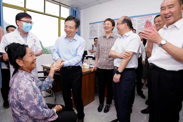 5 月 21 日,浙江省委常委、杭州市委书记周江勇一行在考察从江县贵运萧山传化安心卫生室时,为正在卫生室培训村医的萧山区第一人民医院儿科副主任医师蔡勇和超声科副主任医师张升芳点赞,鼓励萧山援黔的医护人员们积极深入基层,为从江脱贫脱困注入新力量,将优质的医疗服务带到基层,让老百姓得到实惠。