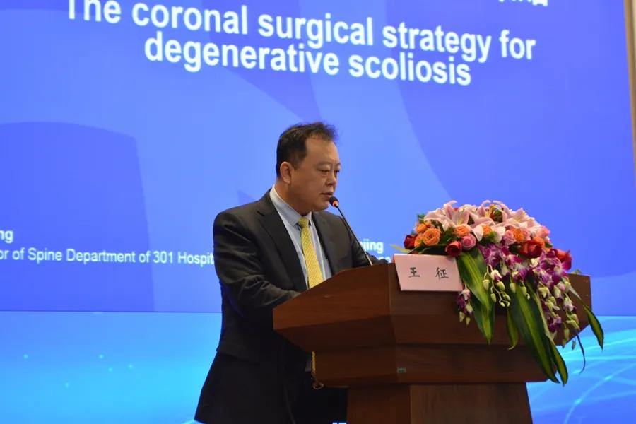解放军总医院(301 医院)王征教授讲解了《退行性脊柱侧凸畸形冠状位失衡整体矫形策略》议题。