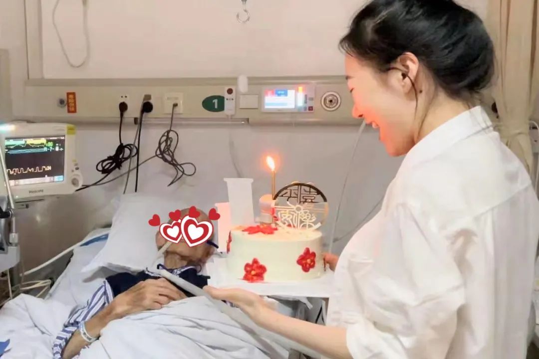27 日早,偶然听到老人的陪护提起今天是老人的 93 岁大寿后,呼吸与危重症医学科医护人员提前定制了生日蛋糕。傍晚,医护人员推着蛋糕来到李爷爷的病床前,送上真挚的生日祝福。在一声声祝福中,李爷爷的脸上洋溢着幸福的笑容。