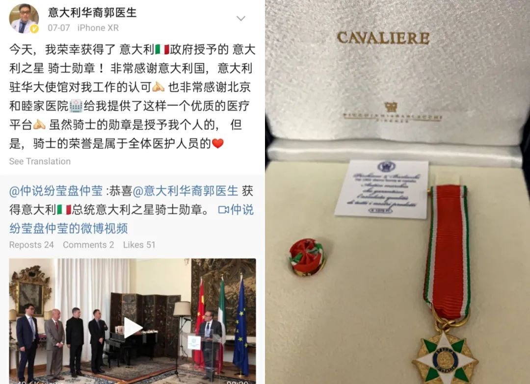 近日,在意大利大使官邸举办的一场授勋仪式上,北京和睦家医院的郭坦坦医生因在新冠疫情之际所展现出的人道主义精神和实施的慈善义举,被授予意大利共和国荣誉勋章——意大利之星骑士勋章。