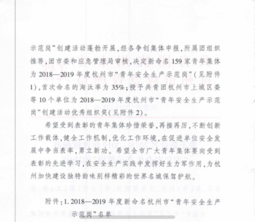 为深化「号手岗」青字号品牌建设,广泛带领青年岗位建功,树立「生命至上,安全发展」理念,助力青年成长成才,从 2018 年 5 月开始,全市共有 234 个青年集体参与创建青安岗活动。经过申报,所属团组织推荐,团市委和应急管理局审核及争创单位 ppt 汇报和现场考核,最终新命名了 159 家青年集体为 2018—2019 年度市级「青年安全生产示范岗」,其中,杭州市肿瘤医院中医综合肿瘤科也获得此荣誉。