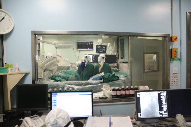 祁明主任在为鲁进医生进行介入手术