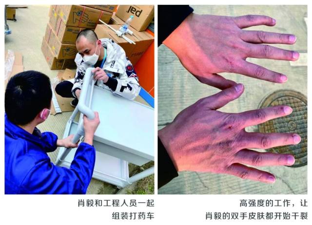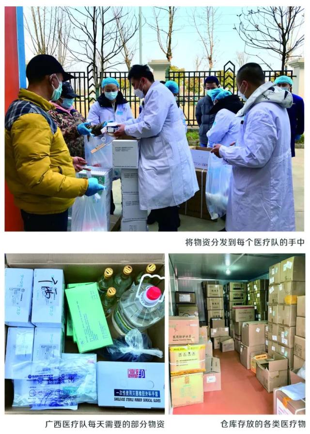 「我们每天要给医疗队供应各类防护服、防护镜等防护用品 600 套,N95 口罩 1200 个,靴套 1500 双,还有大量酒精、消毒液等物资,这还只是供应医疗人员,我们还要供应患者每天所需的医疗用品,比如口罩、鞋套、手消液等等,光手消液一天就要使用 160 瓶……」肖毅一边清点库存,一边准备每个医疗队每天需要的物资。