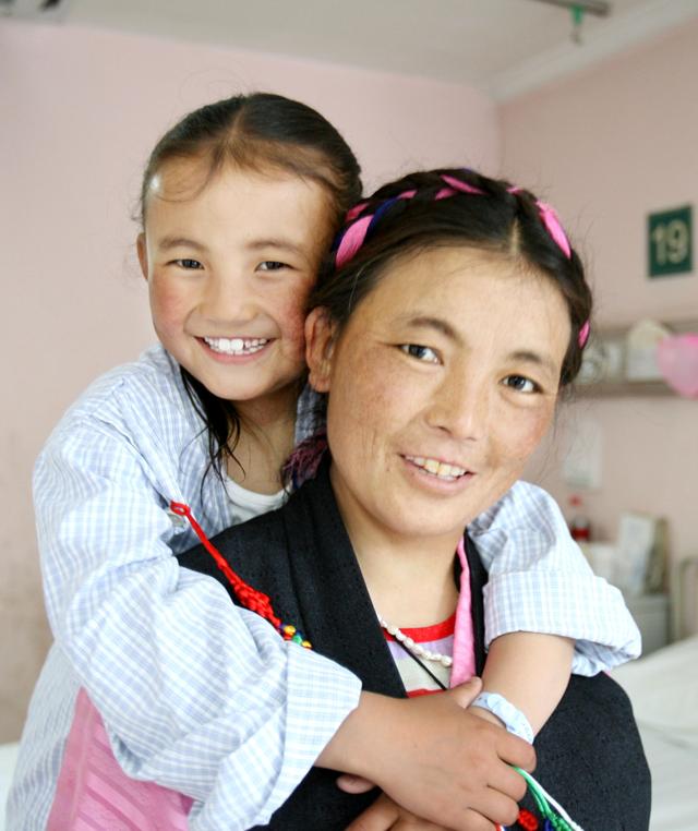 2019 年,亚心医院陶凉院长(右 1,央珍的手术医生)和沈群山主任(左 1,儿童病区主任)去西藏义诊并看望央珍(中)