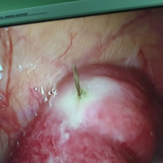 当腹腔镜进入张先生的脏器后,医生在终于找到了他腹痛难忍的原因,一根小小的鱼刺竟然戳破了小肠!