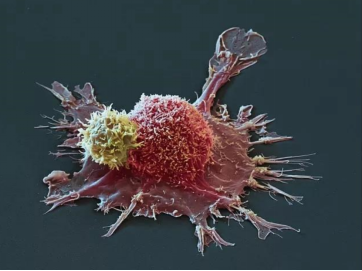 放大 2600 多倍的 CAR-T 细胞(黄色)攻击癌细胞 (红色) 的图像
