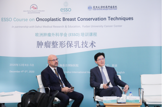 ESSO 主席(2018-2020)、上海嘉会国际医院乳腺外科主任 Tibor Kovacs 也担任本次培训主席,他与吴炅教授一起对课程进行了介绍。Tibor Kovacs 主任还是 ESSO 乳腺肿瘤整形外科课程的主席和创始人,担任多个享有盛誉的国际乳腺外科大师班导师。