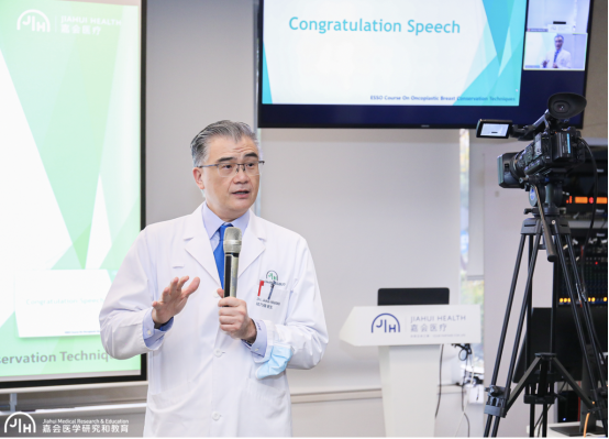 在上海嘉会国际医院举办的课程启动仪式上,作为本次培训的大会主席,复旦大学附属肿瘤医院副院长、乳腺外科主任医师吴炅教授用英文对相关课程进行了介绍,并向线上、线下参与课程的中外医生表达问候与期待。