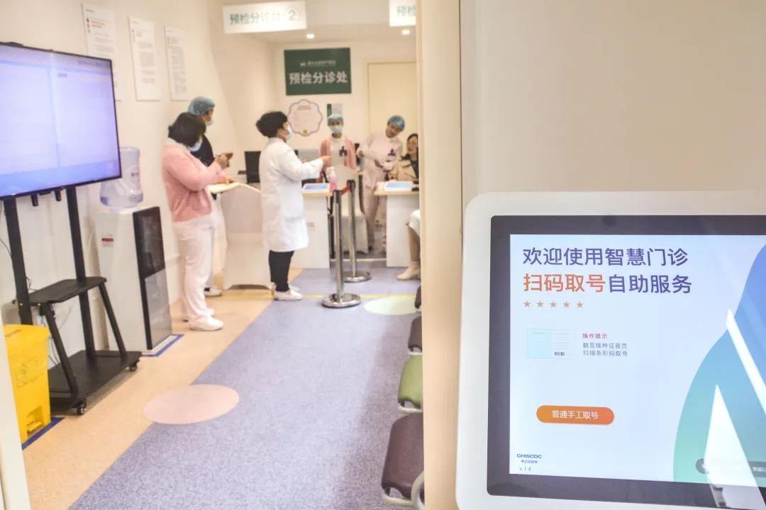 受种人员来到门诊,首先需在自助取号机进行取号,依序排队等待转入预检分诊。