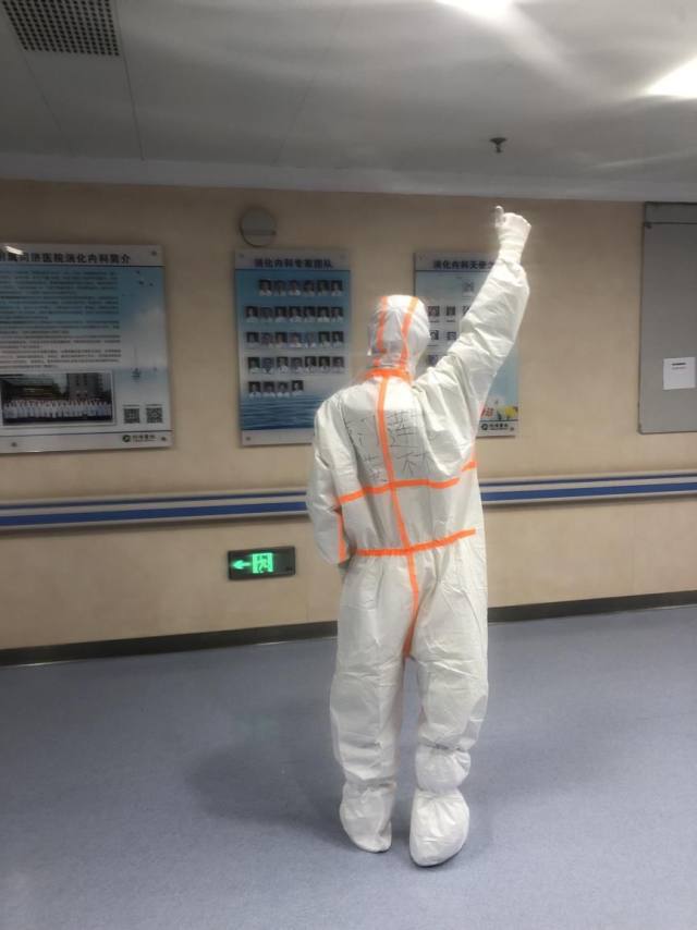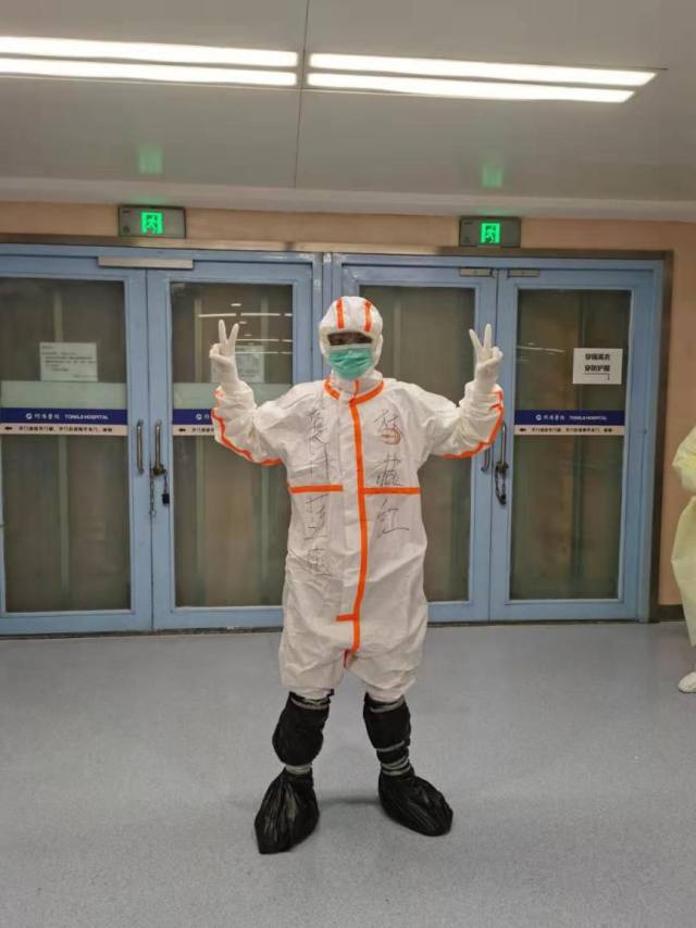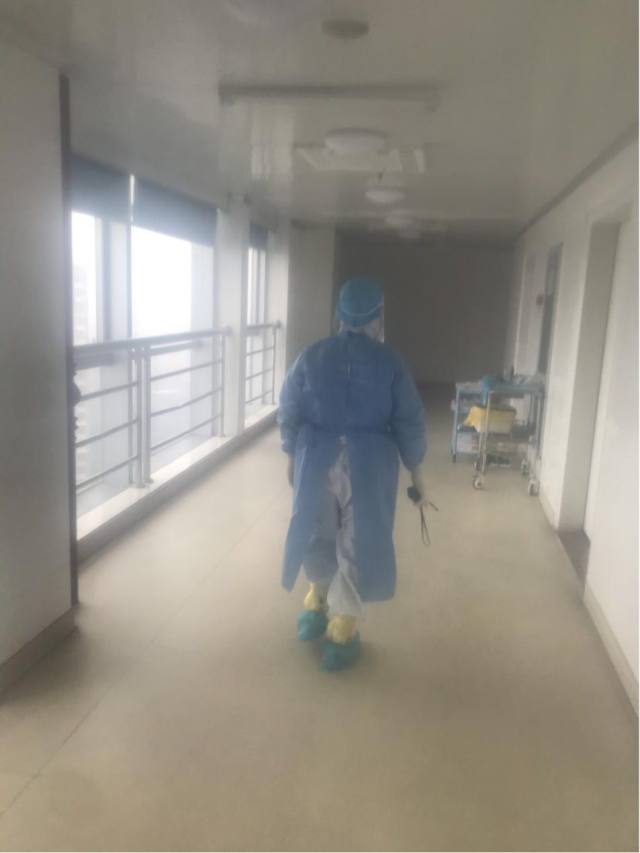 进去没多久我感觉全身冒汗,脸也发烫,我们面屏上都已经起了一层雾,在慢慢形成水珠往下滴,看任何东西都模糊得像在看油画那么不真实。在病房做治疗进出每个房间开门关门都要认真做手卫生,过了一会我觉得我的头被面屏夹得生疼。面屏有雾,看不清,头套盖住耳朵,听不清,耳朵被口罩勒得很疼。我告诉自己再坚持一下,再坚持一下就下班了。等到四点多,终于和同事互相监督对方正确脱掉一层一层的「盔甲」。我知道这些困难跟前期就奋战在一线的前辈们比起来并不算什么,我告诉自己要加油!希望我们能早一点打赢这场没有硝烟的战役,所有人都微笑着呼吸新鲜空气!
