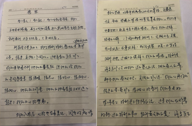 「为了亲人!为了自己!为了对社会负责,我们主动要求隔离,并于 2 月 9 日凌晨进入武汉客厅方舱医院,分别分到 B 区**床,C 区**床……福建的黄二燕护士很细心地观察到我们是夫妇。情人节早上,特别送上祝福的话。这是我们在非常时期过的特别的节日,收到的最无私的爱。……他们是当今最美的『白衣天使』隔离疫情,不隔离爱。今天是情人节,在工作期间,我收到了一对党员夫妻手写的感谢信,阿姨当面亲自来念信给我听……因为有她们我才觉得今天意外的特别。