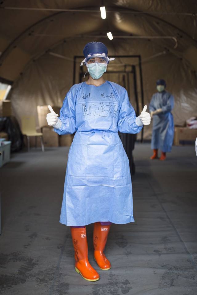 我喜欢在每次进病区前,在防护服上写好名字,然后画一些图案。有时我会画上厦门的沙茶面,还有武汉的热干面,配上:「福建厦门沙茶面祝热干面加油!」有时,我会画厦门鼓浪屿、胡里山炮台等。我想让患者感受到童趣,希望他们在房病里能轻松点。