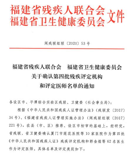 近日,经省残联、省卫健委研究确认,厦门莲花医院正式成为第四批《中华人民共和国残疾人证》残疾评定机构,评定类别为肢体、精神、智力、言语。同时,我院郭金煌、冯健翀、张文超、李鹤龄、陈文汉、梁宝利、方德新 7 位医生确认作为评定医师。