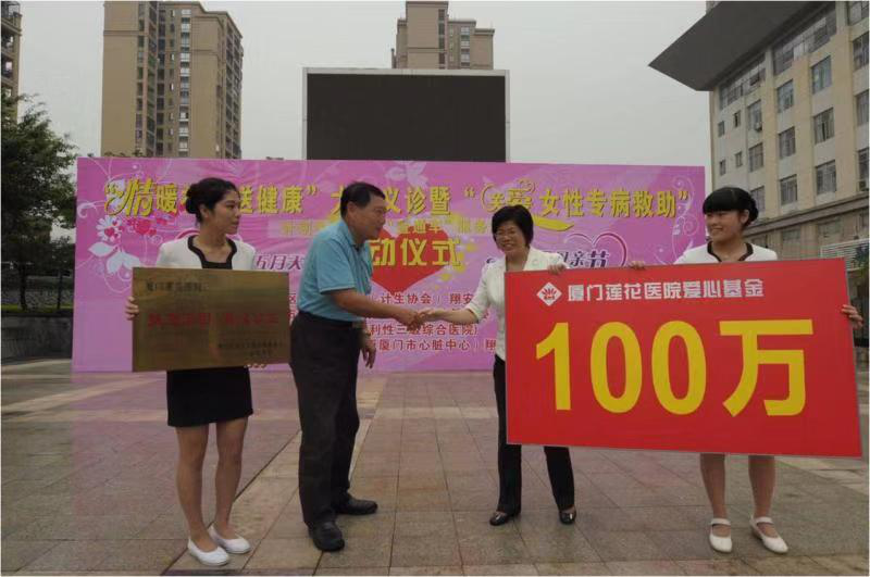 服务社区、热心公益,厦门莲花医院积极投入到公益事业,特别关注妇女儿童及老人群体。2015 年,厦门莲花医院与厦门妇女儿童发展基金会签订并设立的 100 万元专项救助爱心基金。为使更多困难群体重获健康,我院不断扩大基金救助范围及项目,从最初的贫困妇女妇科重大疾病逐步扩散至贫困妇女儿童重大疾病、精神疾病的救助、体检、慰问、生活救助及春蕾计划助学、关爱妇女儿童公益活动等项目,最高每人可援助 5000 元,受到广大市民的欢迎和信任,现已有三百余位妇女顺利接受莲花医院基金捐助并完成手术。