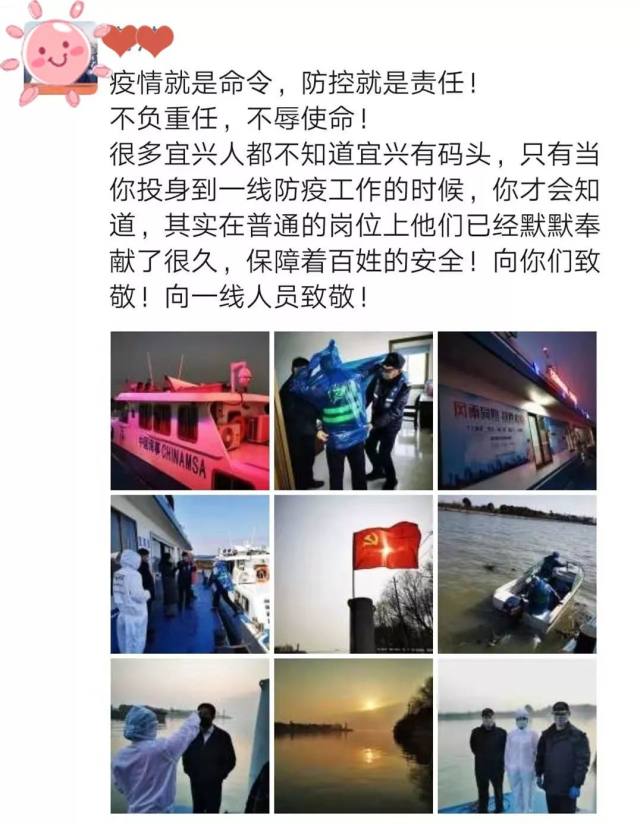 医院更是积极响应号召,投身于社会疫情防控的第一线。2 月 1 日,积极响应宜兴市卫健委号召,九如城(宜兴)康复医院需抽调人员,每日 3 班倒,参加新型冠状病毒感染的肺炎疫情水路运输管控工作。九如城(宜兴)康复医院、健康管理中心的 8 名同事发扬大无畏、不怕苦、不为难的精神,第一时间主动报名,冲向防控前线!正如其中一名同事所说的那样,「作为一名党员我得冲在第一线,作为一名医务人员我更应该和一线人员共同奋斗。虽不能奔赴武汉去战斗,但我们依然可以守护好我们当地的百姓和保护好自己,这也是在战斗!」