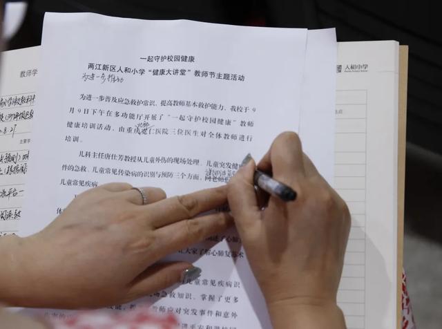 「跌伤不能直接上手揉搓」、「烧烫伤用流动冷水冲洗处理」、「猫狗咬伤第一时间冲、洗、挤伤口」…教师们都拿出小本本,认真地记录起知识要点。