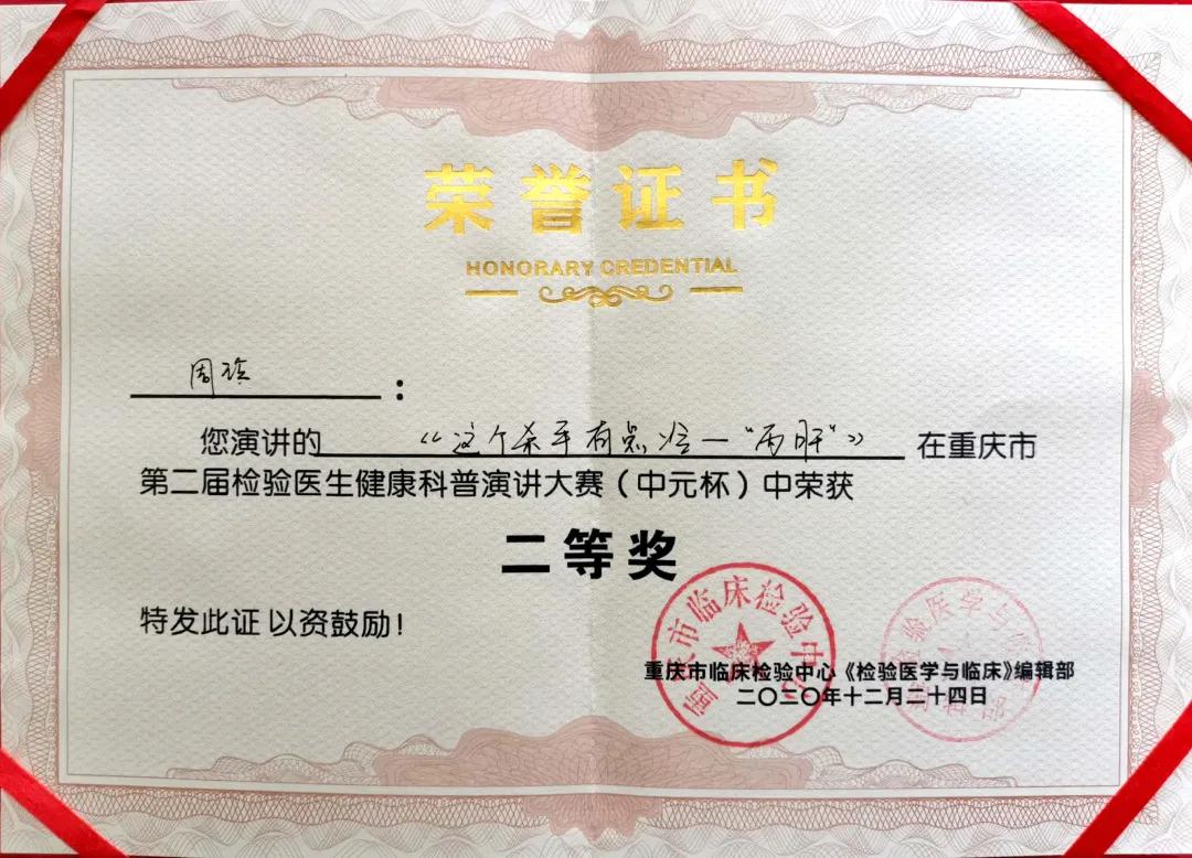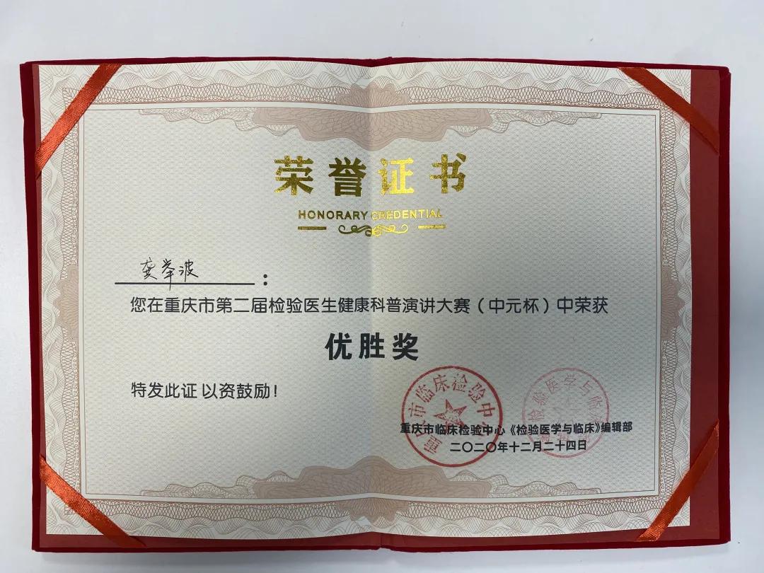 同时,重庆北部宽仁医院检验科龚举波以《HPV 疫苗科普》为题,荣获优胜奖。