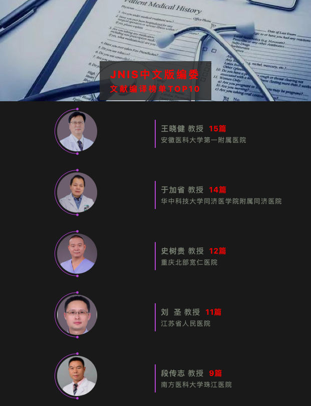 《JNIS 中文版》近日还发布了中文版编委文献编译榜单 TOP10 名单。其中,重庆北部宽仁医院神经疾病科史树贵教授团队以 12 篇的成绩排名前三。
