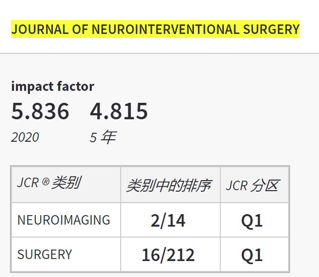 近日,2021 年最新 SCI 影响因子(JCR2020)正式公布,作为神经介入顶级期刊的《Journal of Neurolnterventional Surgery》,影响因子持续上涨,最新 IF5.836,顺利跻身 JCR Q1 区。