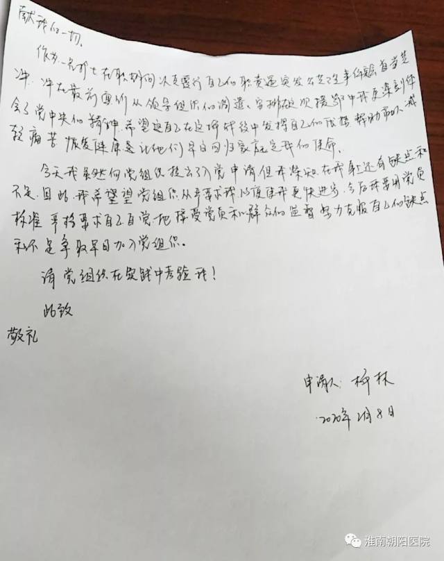 在递交入党申请书时,杨林表示:「虽然我才刚刚递交了入党申请书,还不是正式党员,但我已经把自己当成了一名共产党员,时刻以共产党员的标准要求自己,冲在前、干在先。我们会努力在防控疫情斗争中经受考验,为夺取这场疫情防控战的胜利不懈努力」。