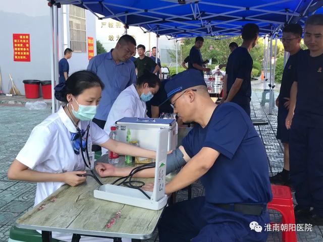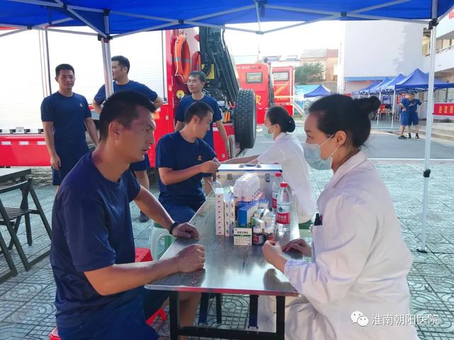 「近日,天气炎热,许多消防员从防汛一线回营后身体不适,请你们速派医生前来诊治。」 8 月 3 日下午,淮南朝阳医院在接到消防部门通知后,迅速安排医生,带上药品赶往现场,以解广大消防员的「燃眉之急」。