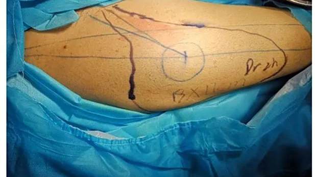 目前患者术后20天,皮瓣血运良好,皮瓣远端部分坏死,坏死面积15%,后期拟行游离皮片移植治疗。
