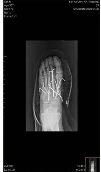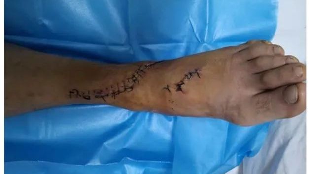 另一位患者米某,劳动时被机器切割左踝部,致踝前血管神经肌腱断裂,急诊给予行胫前动静脉吻合,腓深神经吻合,胫前肌、踇长伸肌腱、趾长伸肌腱吻合,吻合一次通血成功,目前术后两周后患者恢复良好。