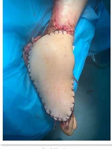患肢供区血管变异,原本计划取旋股外侧动脉降支为供区血管,可患者个体差异为旋股外侧动脉斜支,并且斜支的穿支血管支配了供区皮肤的大部分血运,故临时改变切取方案,采用旋股外侧动脉斜支为供区血管,调整皮瓣切取部位,顺利分离出主要穿支,并携带肌肉穿支修补足部肌肉缺损;