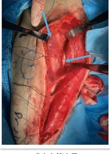 解剖患足足背及胫前血管,见血管外膜挫伤,无血管吻合条件,所以向近端延伸,受制于股前外侧动脉斜支主干长度为8CM,术中临时决定将其与踝上处胫前血管吻合;