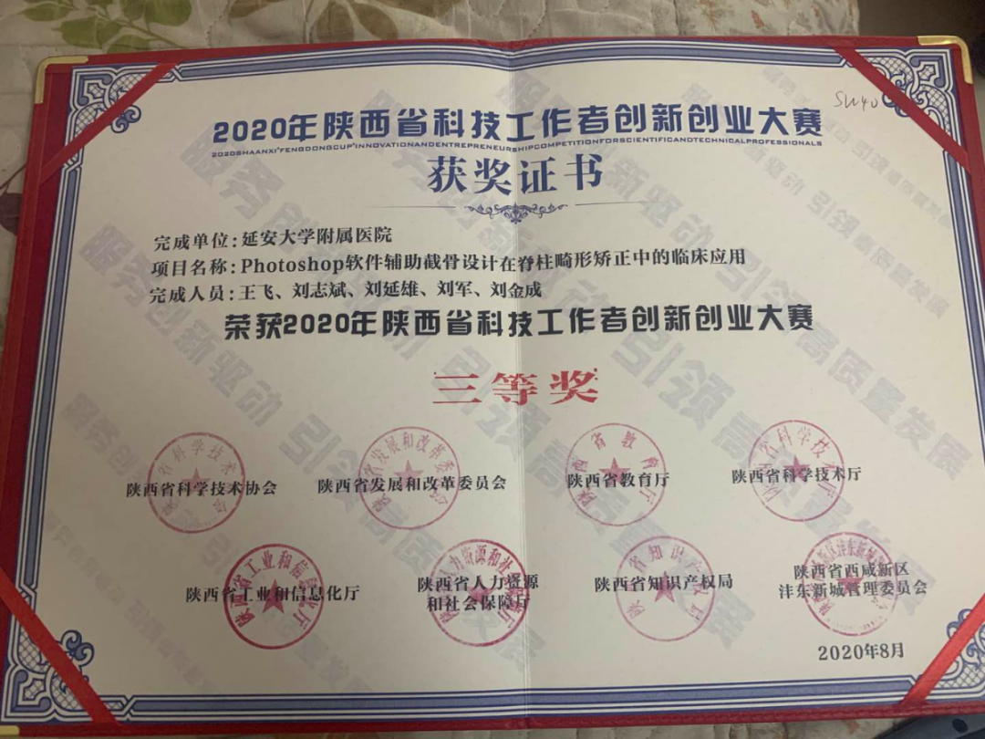 在大赛中,延大附院王飞提交参赛项目《Photoshop 软件辅助截骨设计在脊柱畸形矫正中的临床应用》荣获陕西省科学技术三等奖。