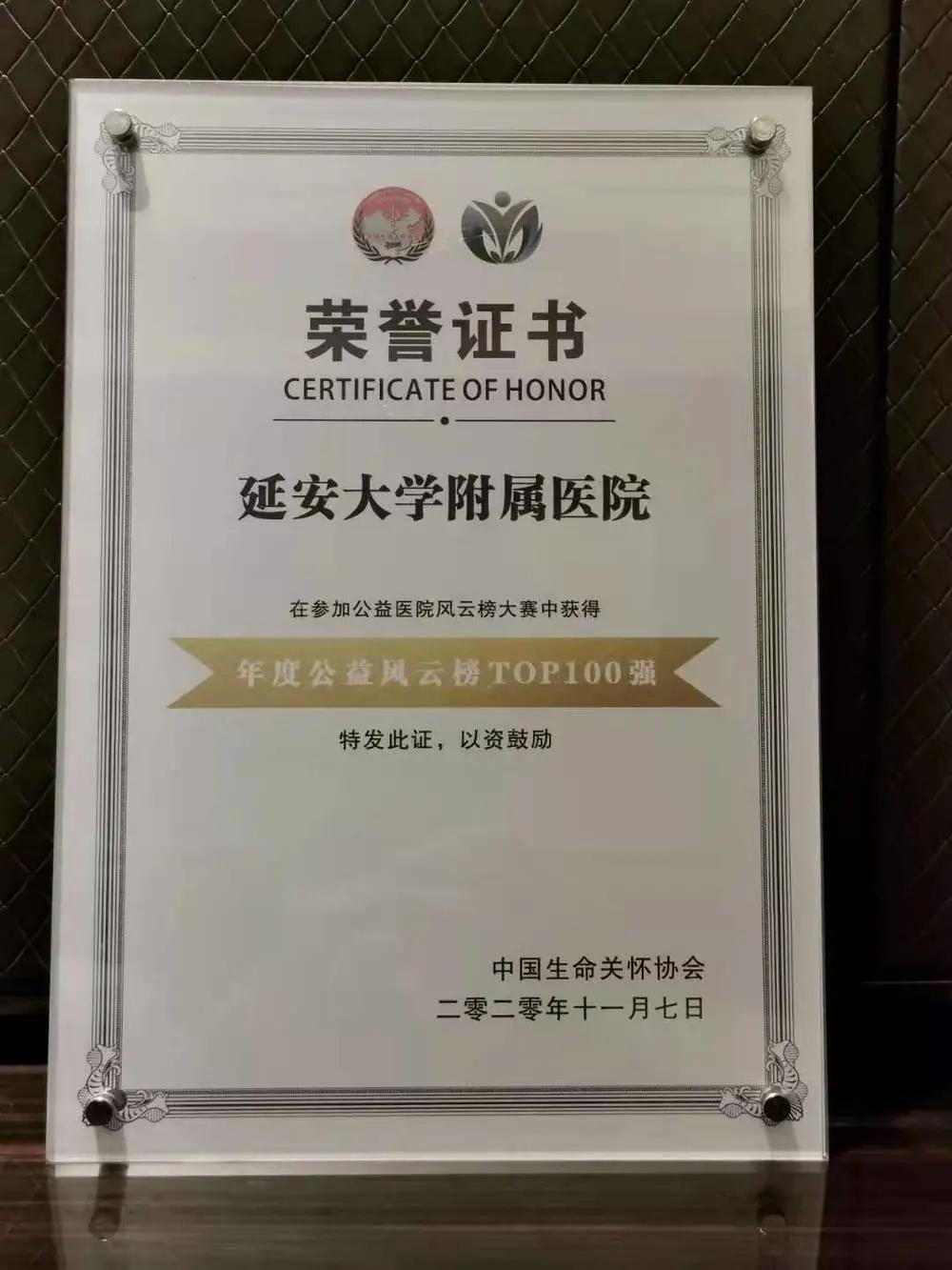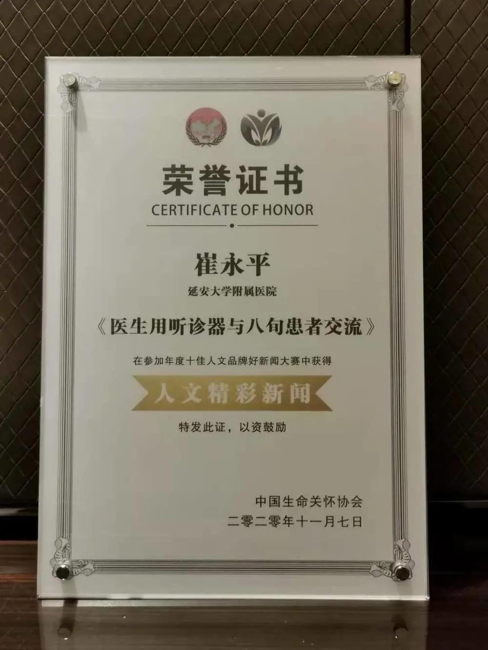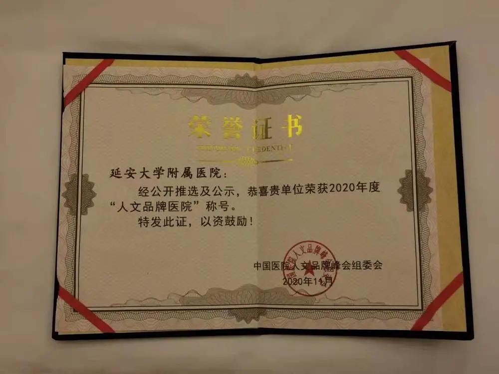 11 月 6 日-8 日,「2020 年中国医院人文品牌峰会」在广西壮族自治区柳州市召开,延大附院荣获「人文品牌医院」称号,并入选「年度公益医院风云榜 TOP100 强」,同时该院崔永平的人文作品《医生用听诊器与八旬患者交流》入选年度人文精彩新闻。
