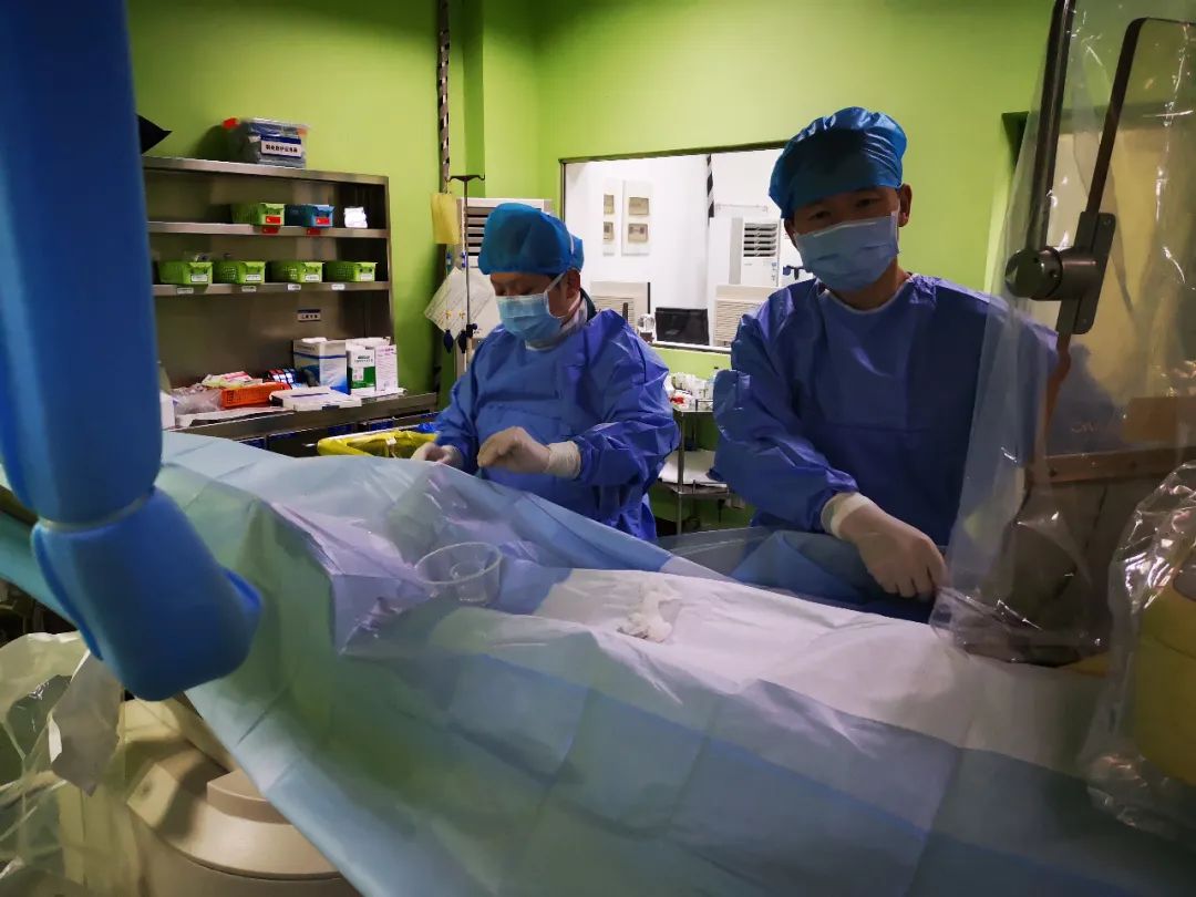13 时 50 分,王先生被护送到了导管室,介入团队立即实施手术。「患者胸痛明显,吗啡 5 mg 静推」、「注意心律、血压」、「备好急救药品、除颤仪」,一句句口头医嘱的有条不紊地下达: