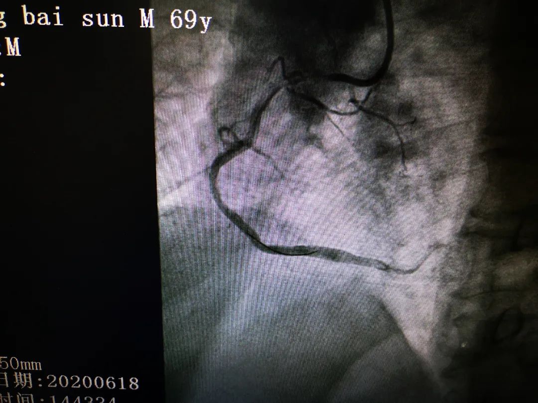 13 时 56 分,行选择性冠脉造影,造影结果显示:前降支中段狭窄 99%,回旋支中段慢性闭塞,右冠近中段急性闭塞,TIMI 血流 0 级。患者冠状动脉三支主要血管均有严重病变,心脏血流灌注突然中断,极易发生恶性心律失常、心脏骤停,死亡风险极高,这让正在手术的吕学祥主任心头一紧,「立即开通右冠,恢复冠脉血流」吕主任当机立断做出了手术指示。