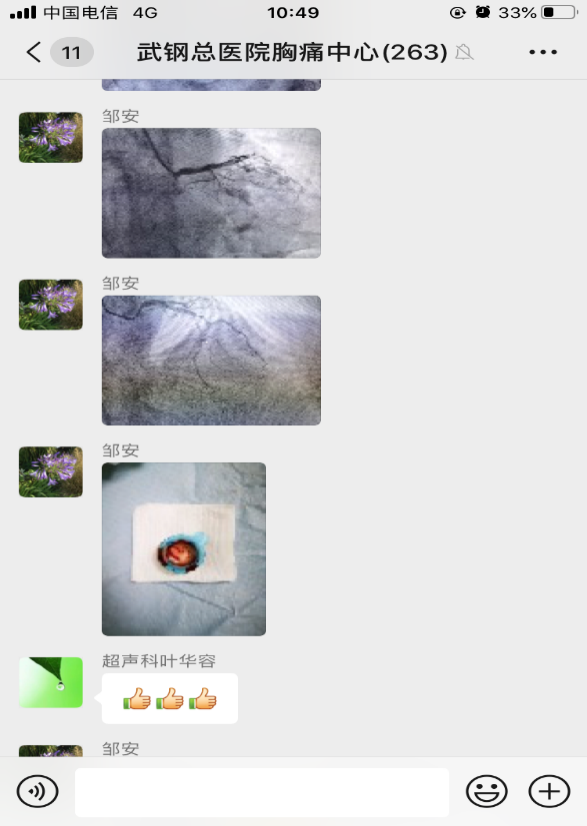 就在此时,心电监护仪发出了尖锐的报警声,「室颤!」,患者意识丧失,手术医师、介入护士几乎同时喊出「电除颤、心肺复苏」!本就紧张的气氛几乎凝固了,电除颤后患者意识恢复,随后又反复发生室颤,心脏骤停及意识丧失。「必须尽全力抢救患者生命,不到最后一刻绝不放弃」所有参与抢救的医生护士都抱着这一信念。患者出现交感电风暴,命悬一线,越是这种危急时刻,越是考验医者的心理素质及团队的密切配合。吕学祥主任心中默念着「保持沉着冷静」,李念主任配合吕主任将手术有条不紊的进行,「通过导丝、抽吸血栓、置入支架……」「胺碘酮静推、万汶扩容、多巴胺升压……」维持患者生命体征。