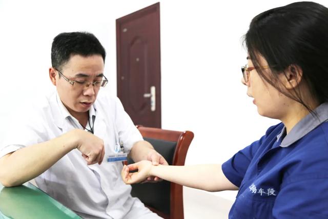 上海海华医院医生吴曰海在结束繁忙的手术后,没有来得及吃上一口午餐就急急忙忙地赶到上海动车段为职工们提供诊疗服务。职工们纷纷带着体检报告前来咨询,邬主任和吴医生都耐心地为他们答疑解惑、查体,讨论病情,并提供后续的诊疗和生活习惯上的建议,受到了职工们的一致好评和感谢。