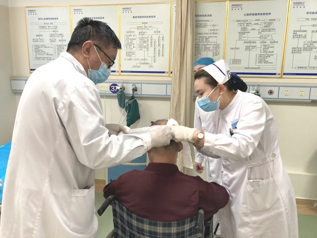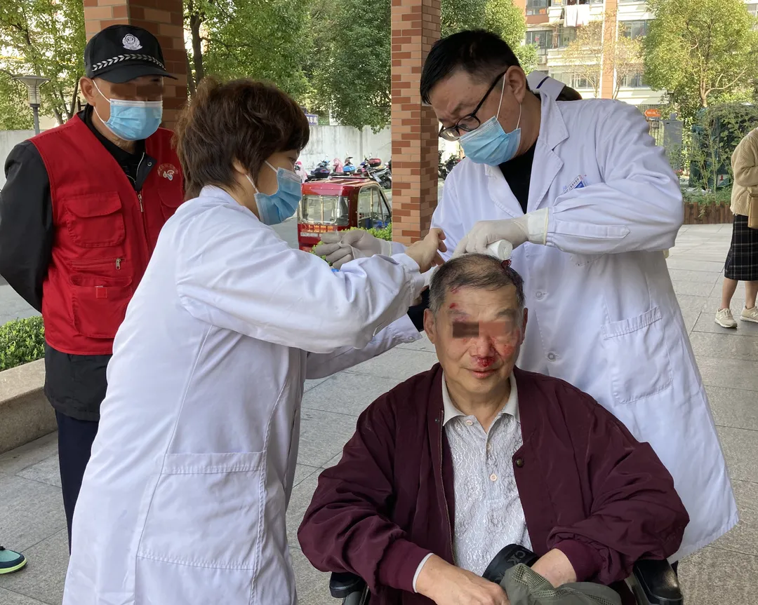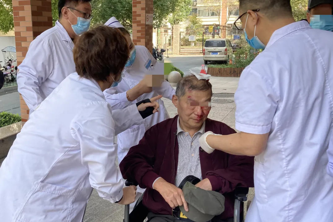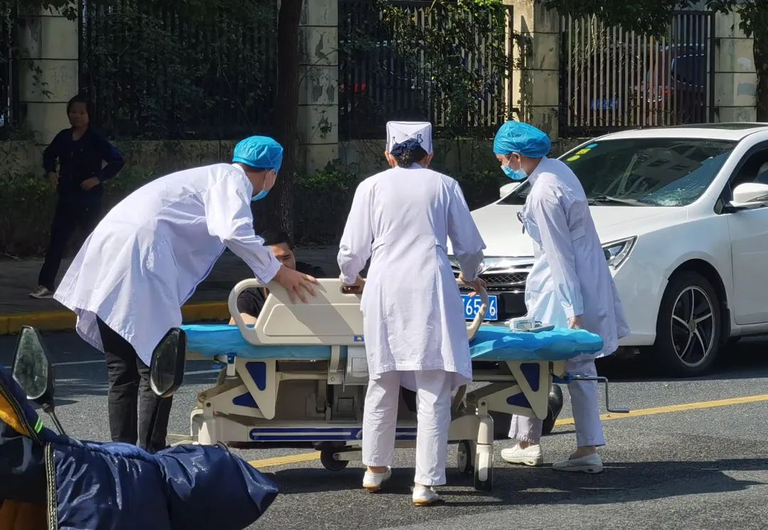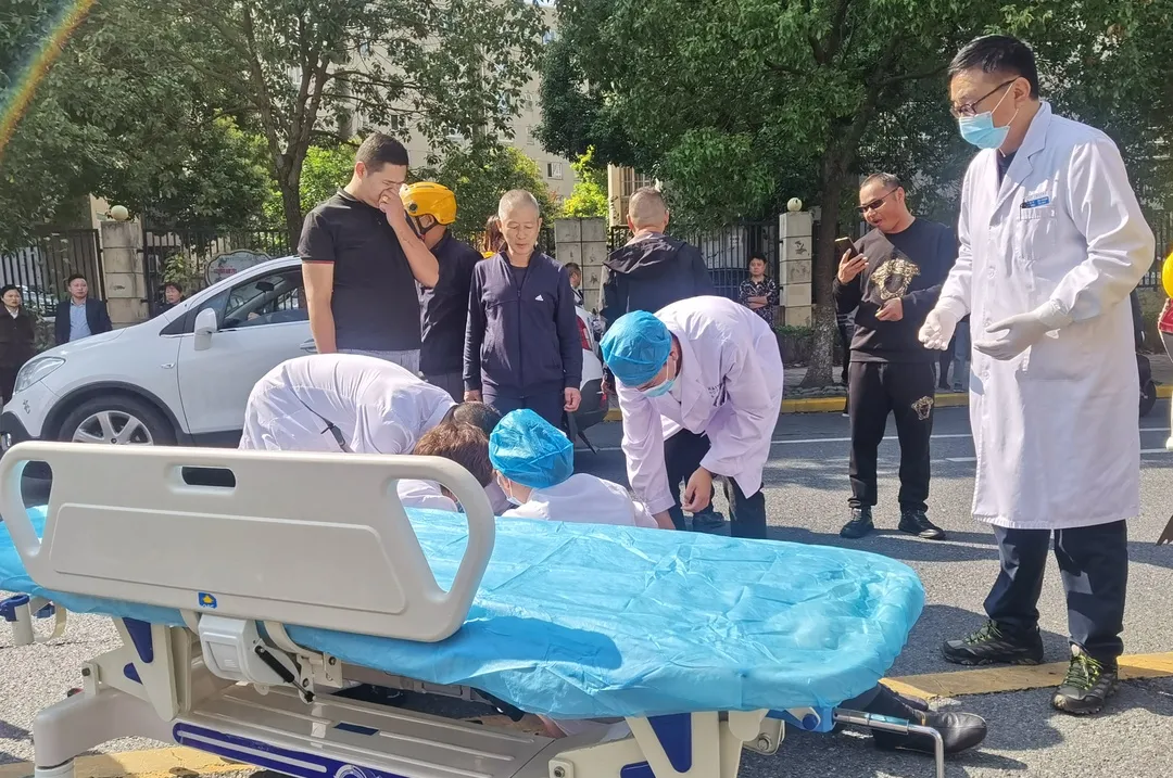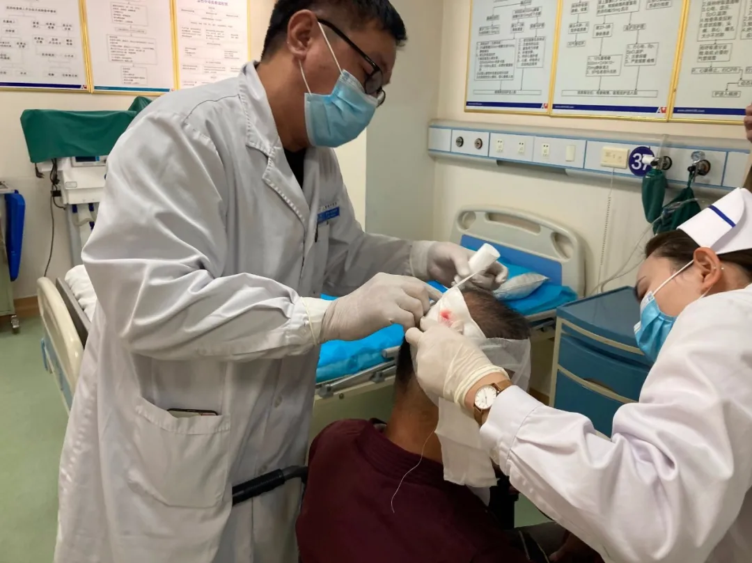 正在工作的急诊科护士长听到了这声巨响,立即启动突发情况应急处理「绿色通道」,携带急救物品并推平车赶到现场。急诊外科主治医师陈硕为患者检测生命体征,将头部伤口初步处理后,于 10 点 20 分推入医院急诊抢救室内。