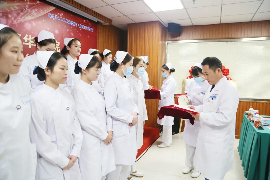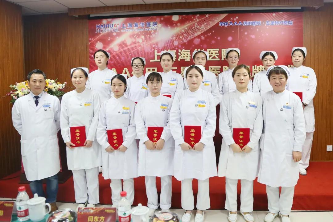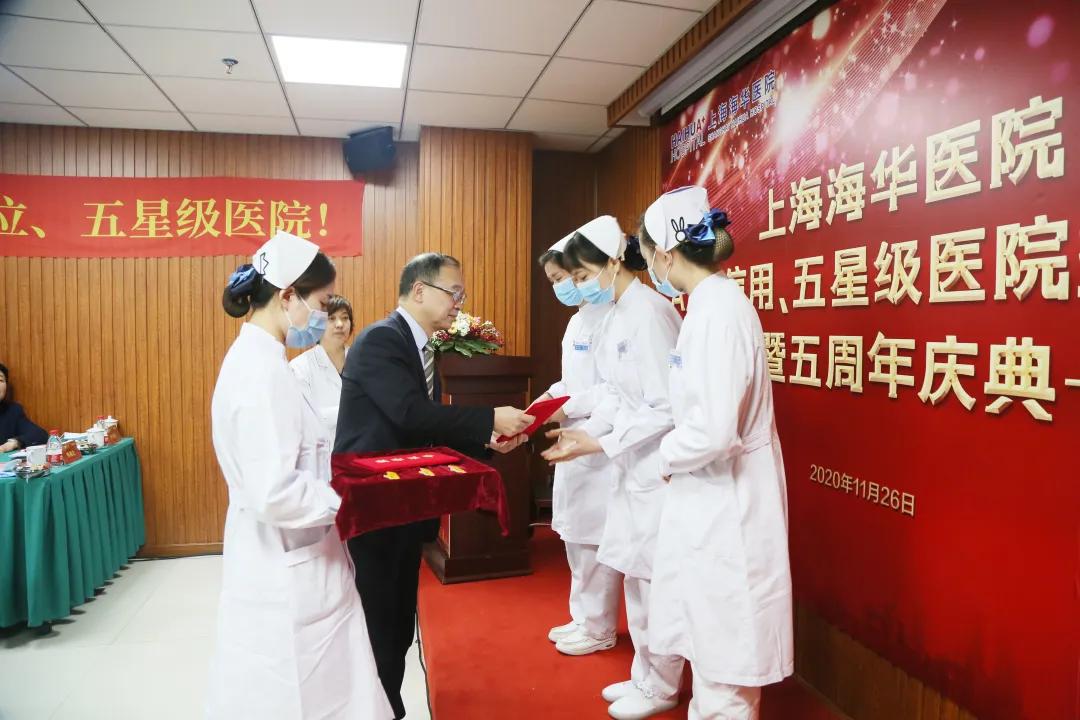 上海海华医院院长罗明为四星级护士授星及颁发证书,上海海华医院副院长安洪宾、护理部主任范蓉儿为三星级护士授星及颁发证书。