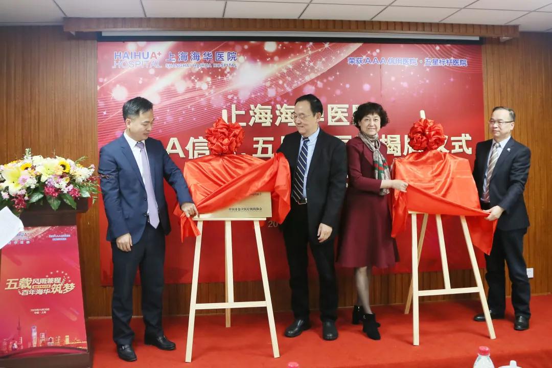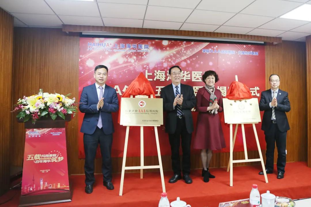 功夫不负用心人,10 月 23 日,医院荣获由中国非公立医疗机构协会认证的信用评价 AAA 等级及能力评价五星级,这对于医院发展具有里程碑式的意义,意味着上海海华医院信用和能力建设纳入非公立医疗机构的国家标准体系。由闫东方会长、钟菊华副会长、李军总经理、罗明院长为上海海华医院进行的 AAA 信用/五星级医院揭牌仪式在大家的热烈欢呼中进行。
